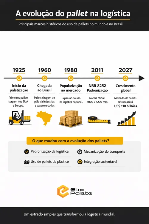 Infográfico sobre a evolução do pallet na logística, explicando o que é pallet e sua padronização.