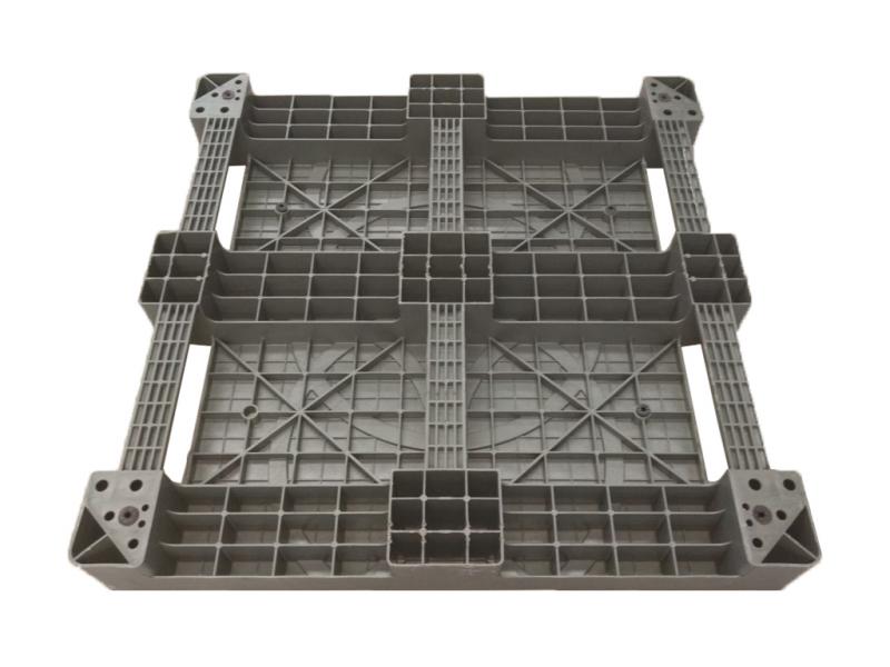 Pallet Plástico 110×110×14 cm para Tambor, suporta 2,5 t estática, 1,5 t dinâmica e 1 t em estantes. Acomoda 4 tambores e possui compartimento para conter vazamentos.